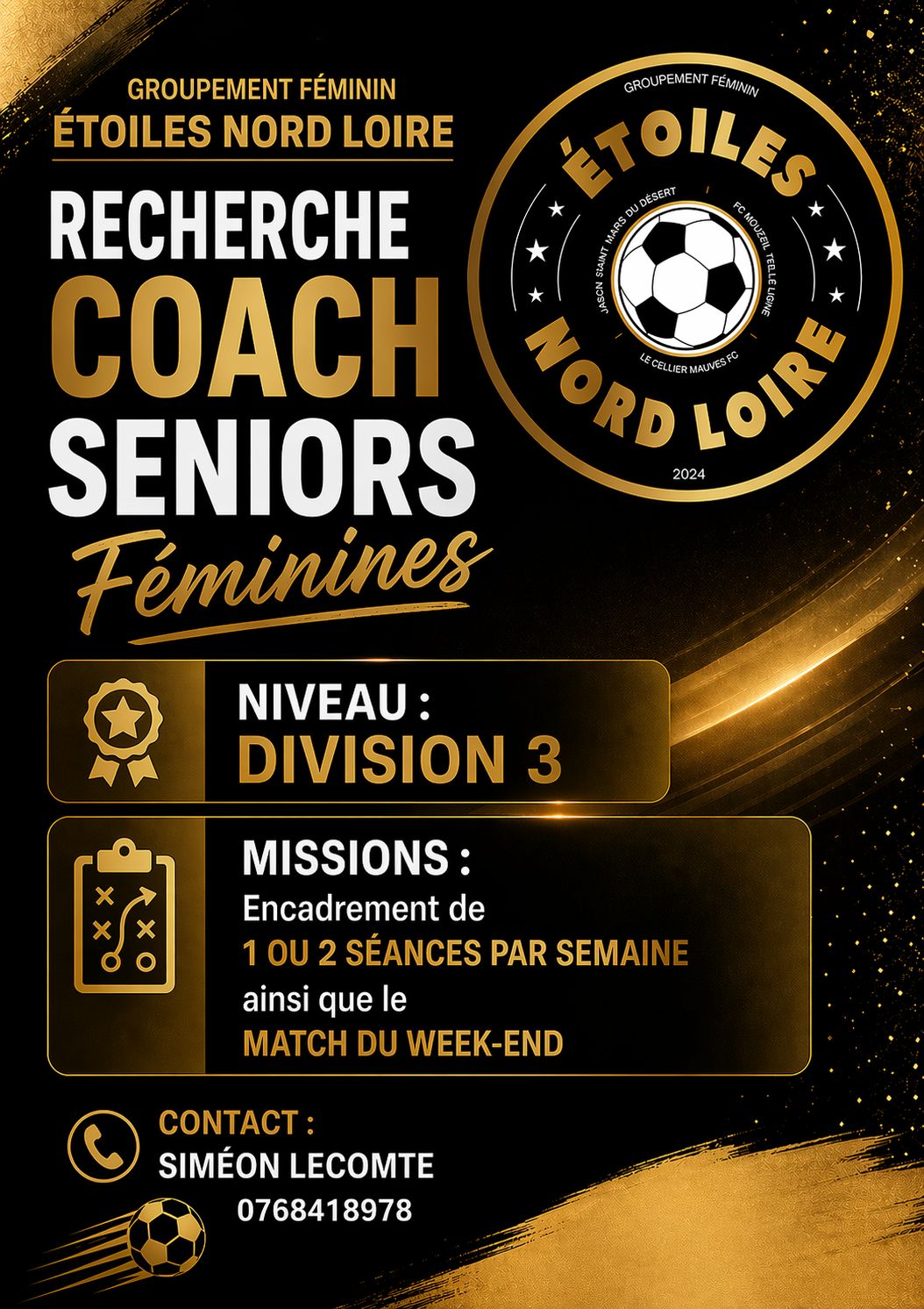 GF Étoiles Nord Loire est à la recherche d’un entraineur Seniors Féminines pour notre équipe foot à 11 en D3 pour l’année prochaine.