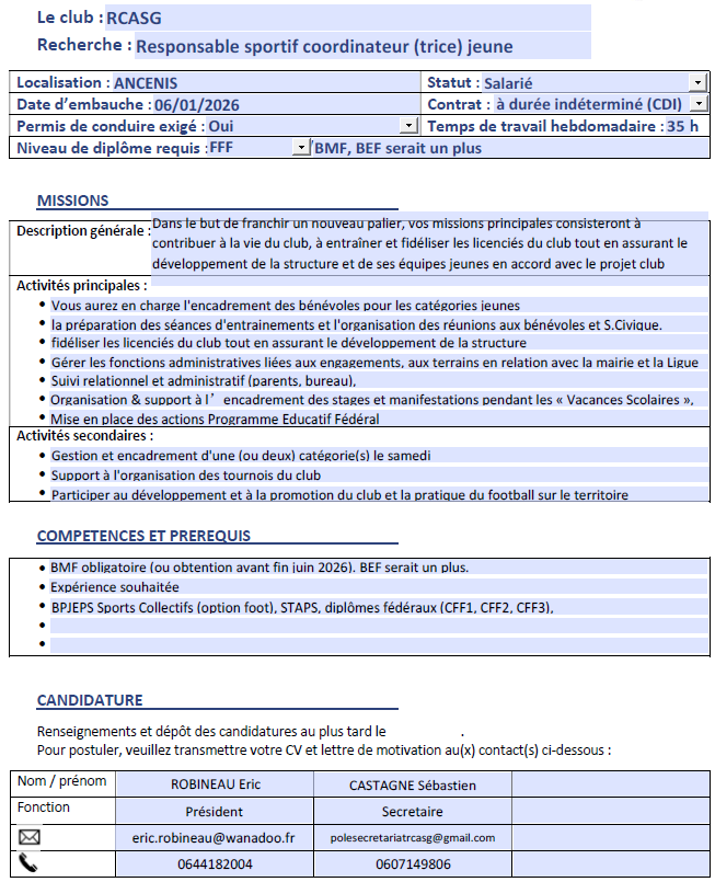 Contact : CASTAGNE Sébastien // Secretaire // polesecretariatrcasg@gmail.com