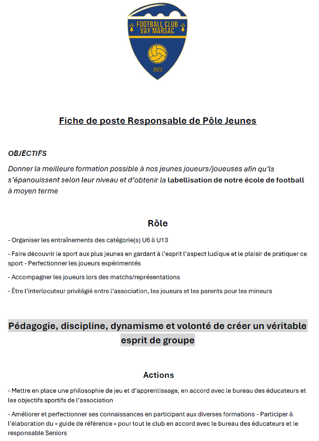 Le FC VAY MARSAC recrute son responsable Jeunes (U6 à U13 – voire U15).