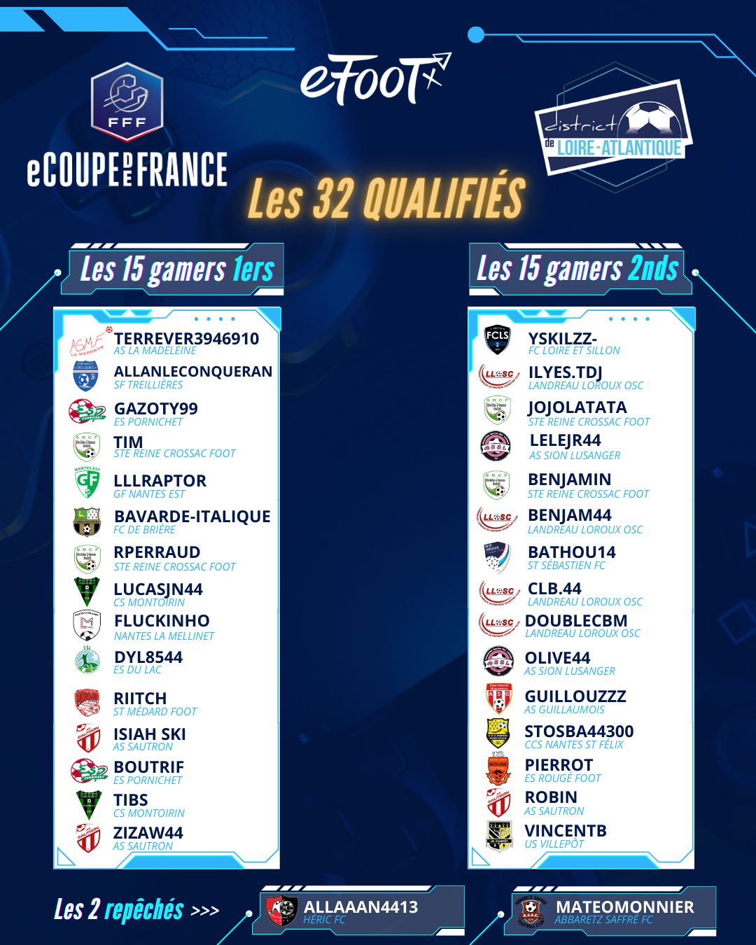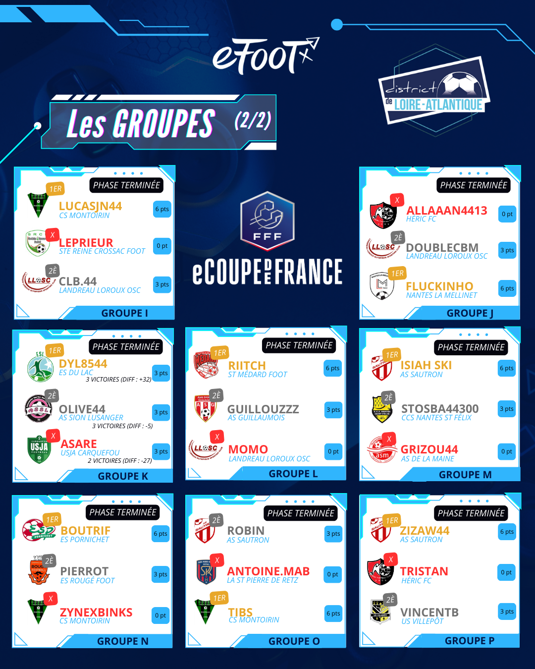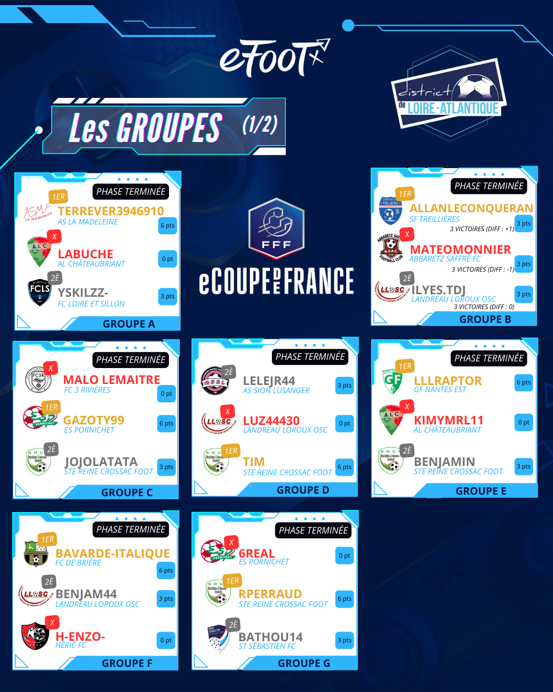 La communication entre gamers se fait par le groupe Discord « 2026-eCoupe de France » - Classements des 16 groupes (cliquez sur les images ci-dessous)