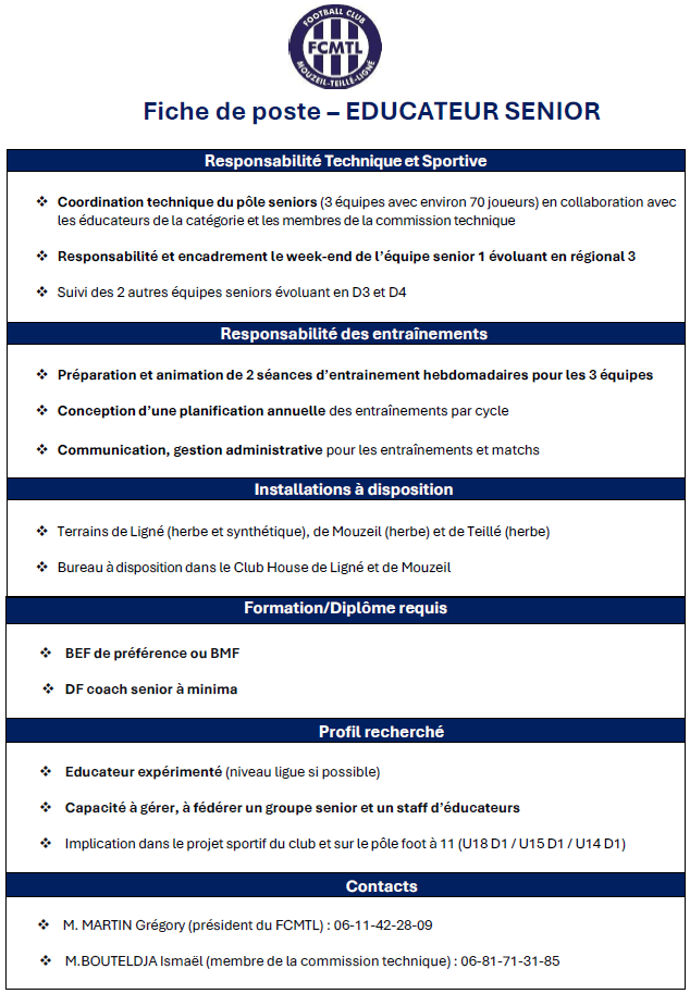 Football Club Mouzeil-Teillé-Ligné recherche son futur éducateur Seniors Masculins pour la saison 2026/2027.