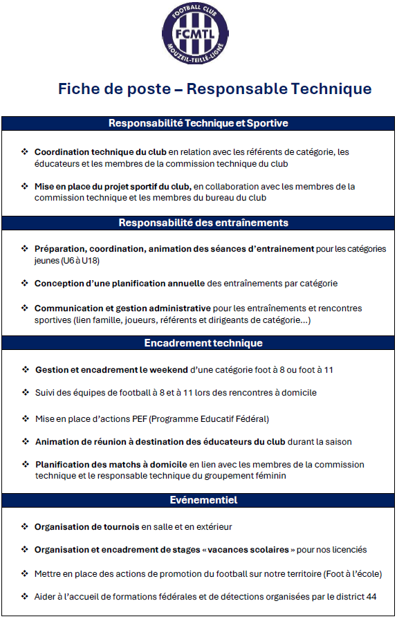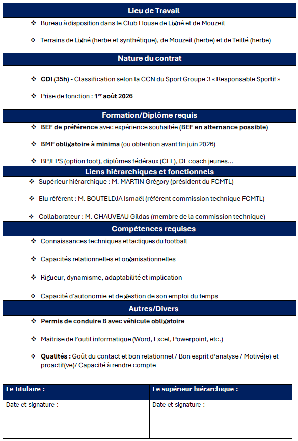 Le Football Club Mouzeil-Teillé-Ligné et son école de football labellisée excellence recherche son futur responsable sportif/coordinateur(rice) technique Jeune pour la saison 2026/2027.
