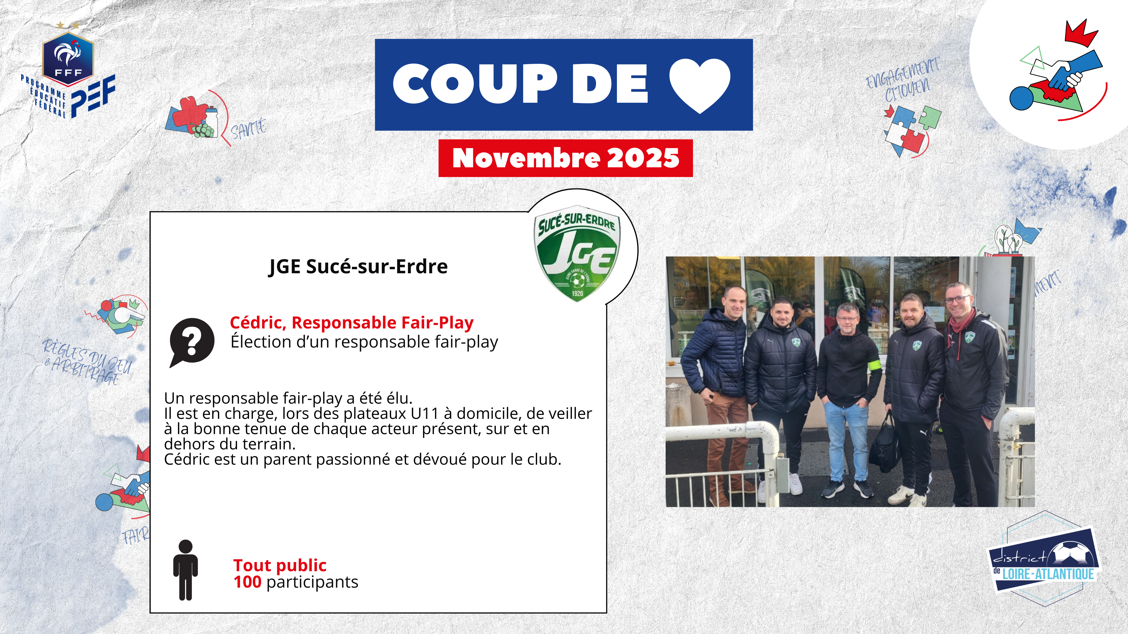 En ce mois de novembre, le club de la JGE Sucé sur Erdre est récompensé par l’action Coup de Cœur du mois de novembre pour son action sur le thème Fair-Play.